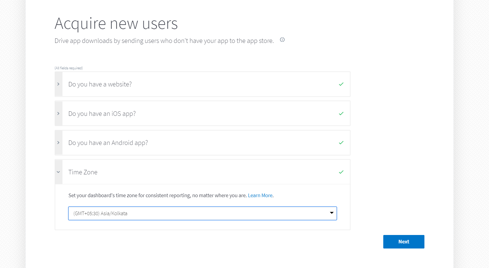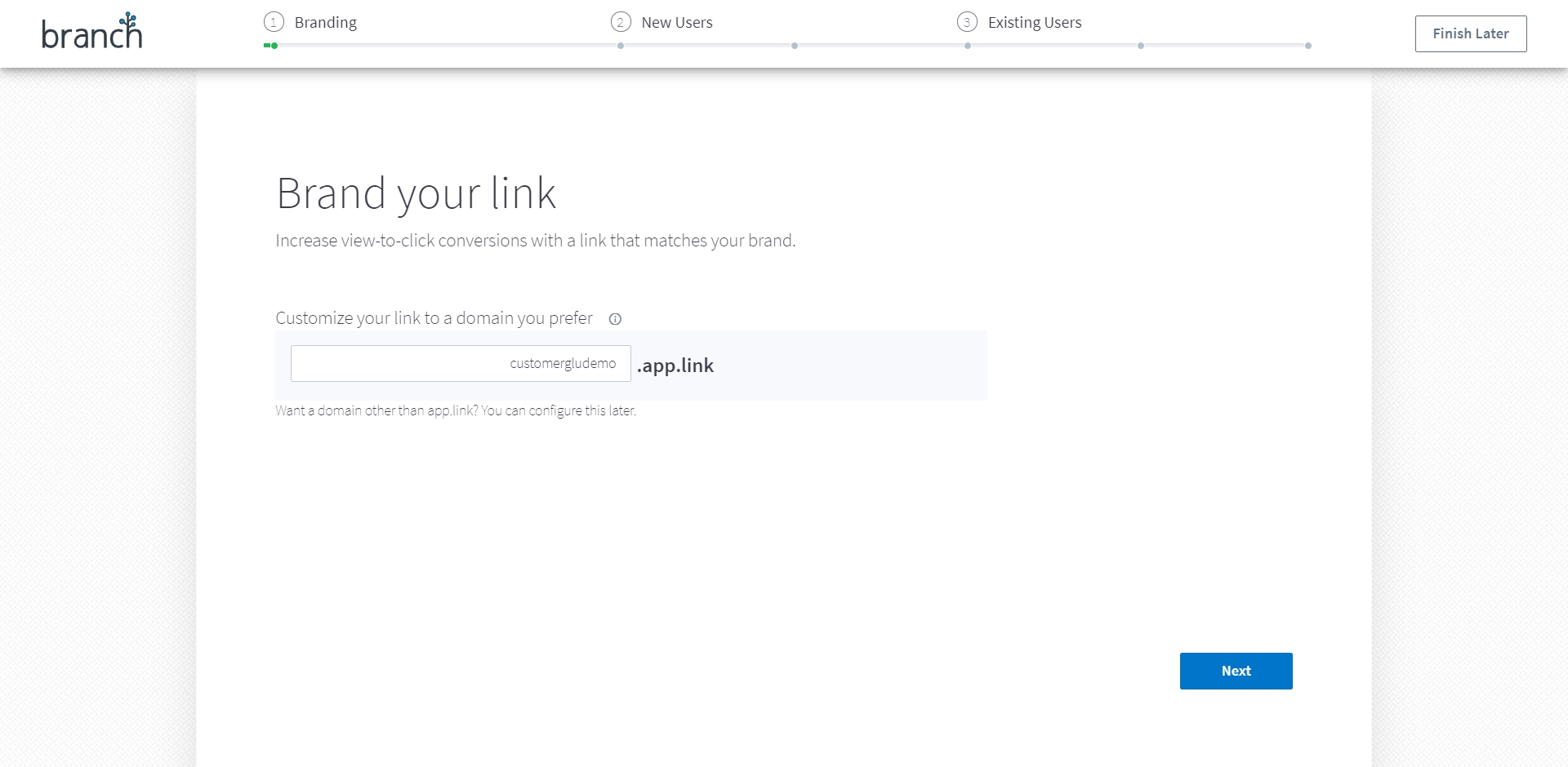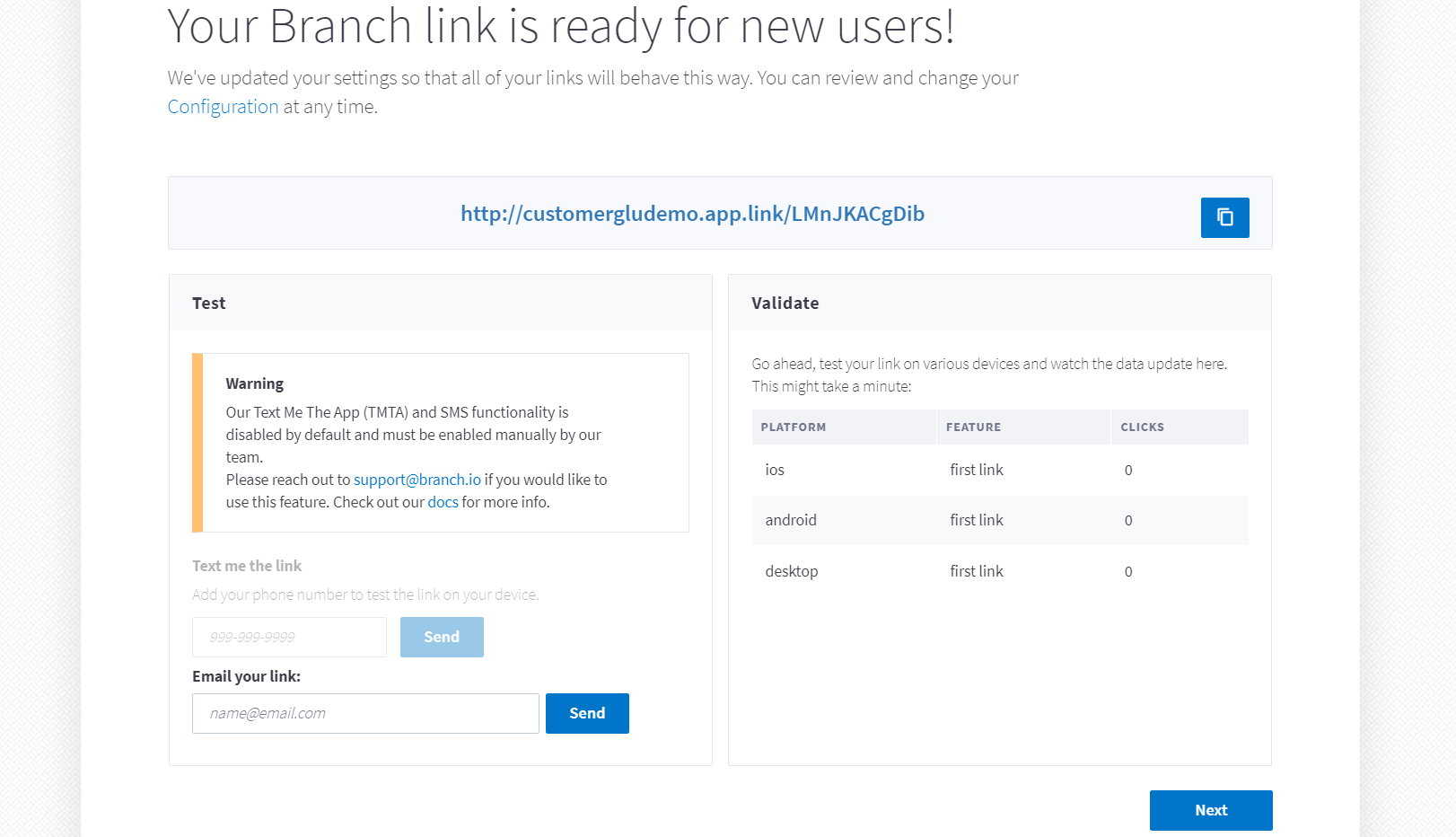 You can now see your first deep link automatically, generated by BranchIO, click on next and it will redirect you to the dashboard