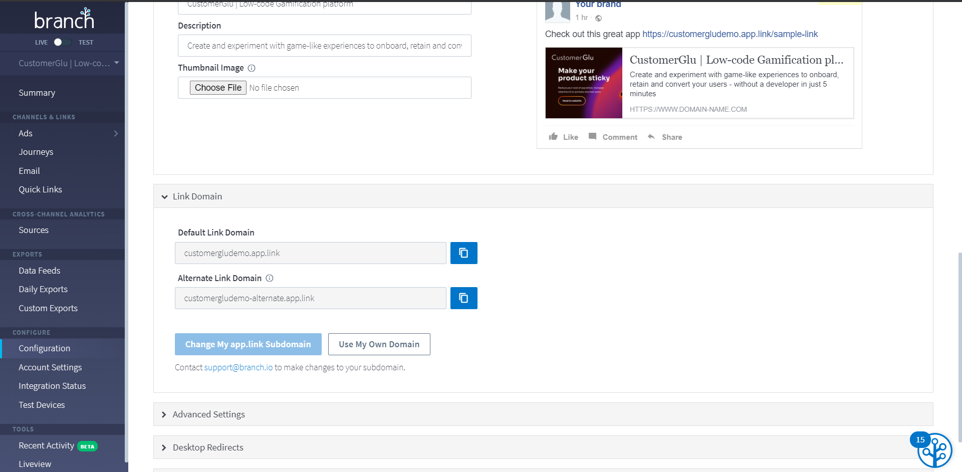 Click on the Configuration on left sidebar and scroll down to link domain section & copy the link under Default Link Domain & share it with CustomerGlu