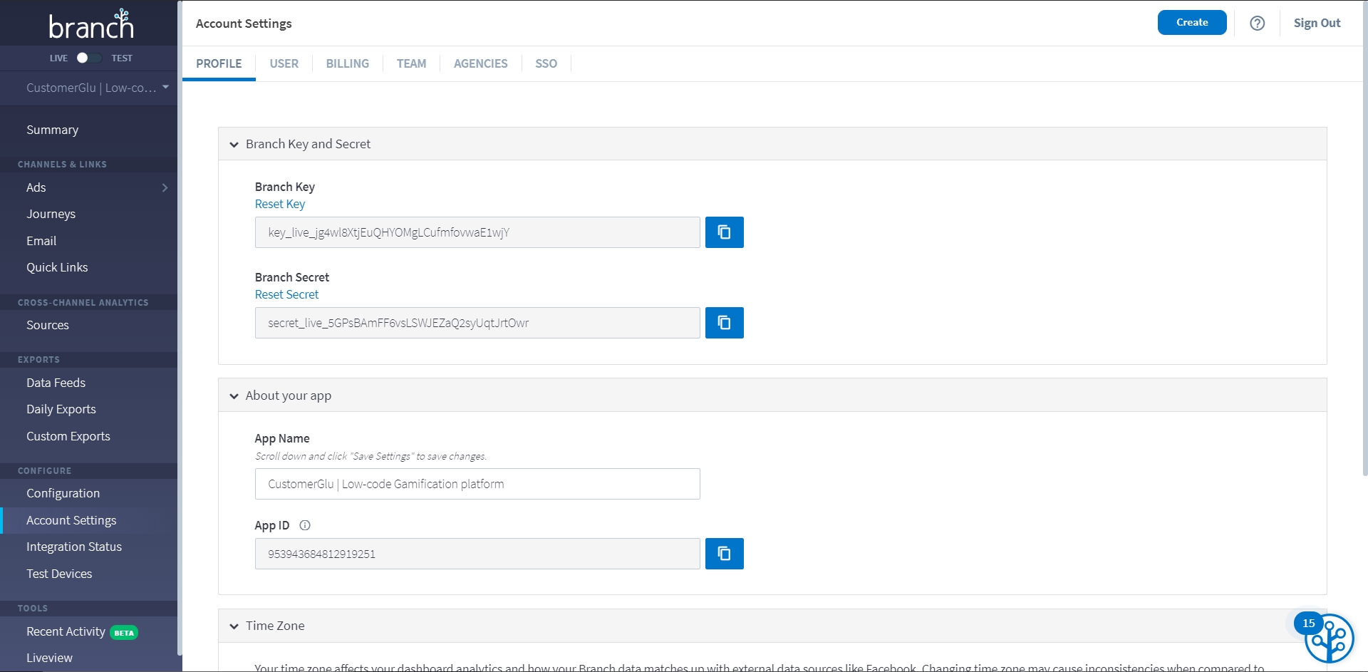 Click on the Account Settings on left sidebar and under Profile tab in Branch Key and Secret section, copy the key & share it with CustomerGlu